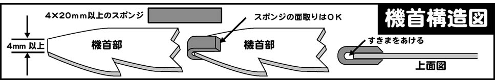 安全のため、機首にゴムスポンジ(4×20mm以上)をU字型に取り付けること。 (機首構造図参照)